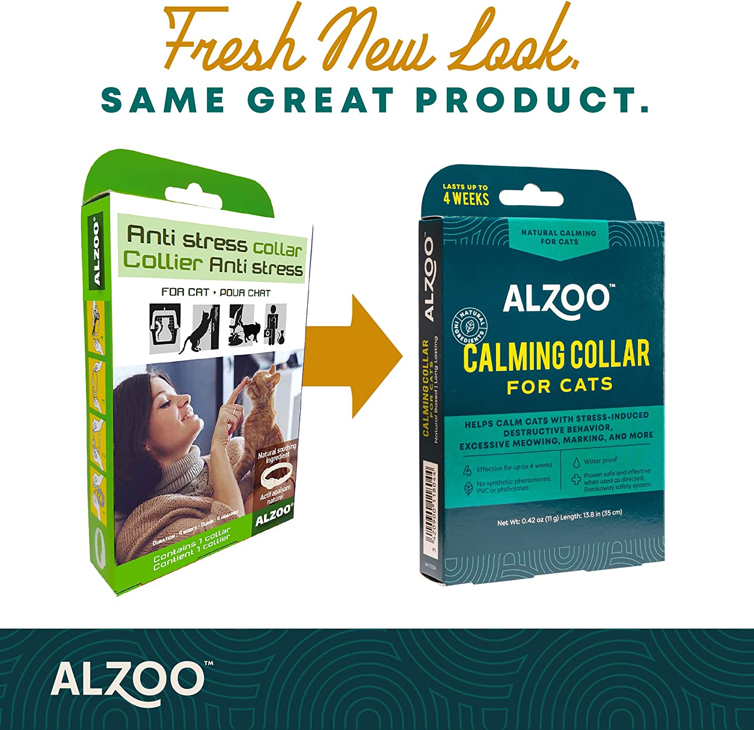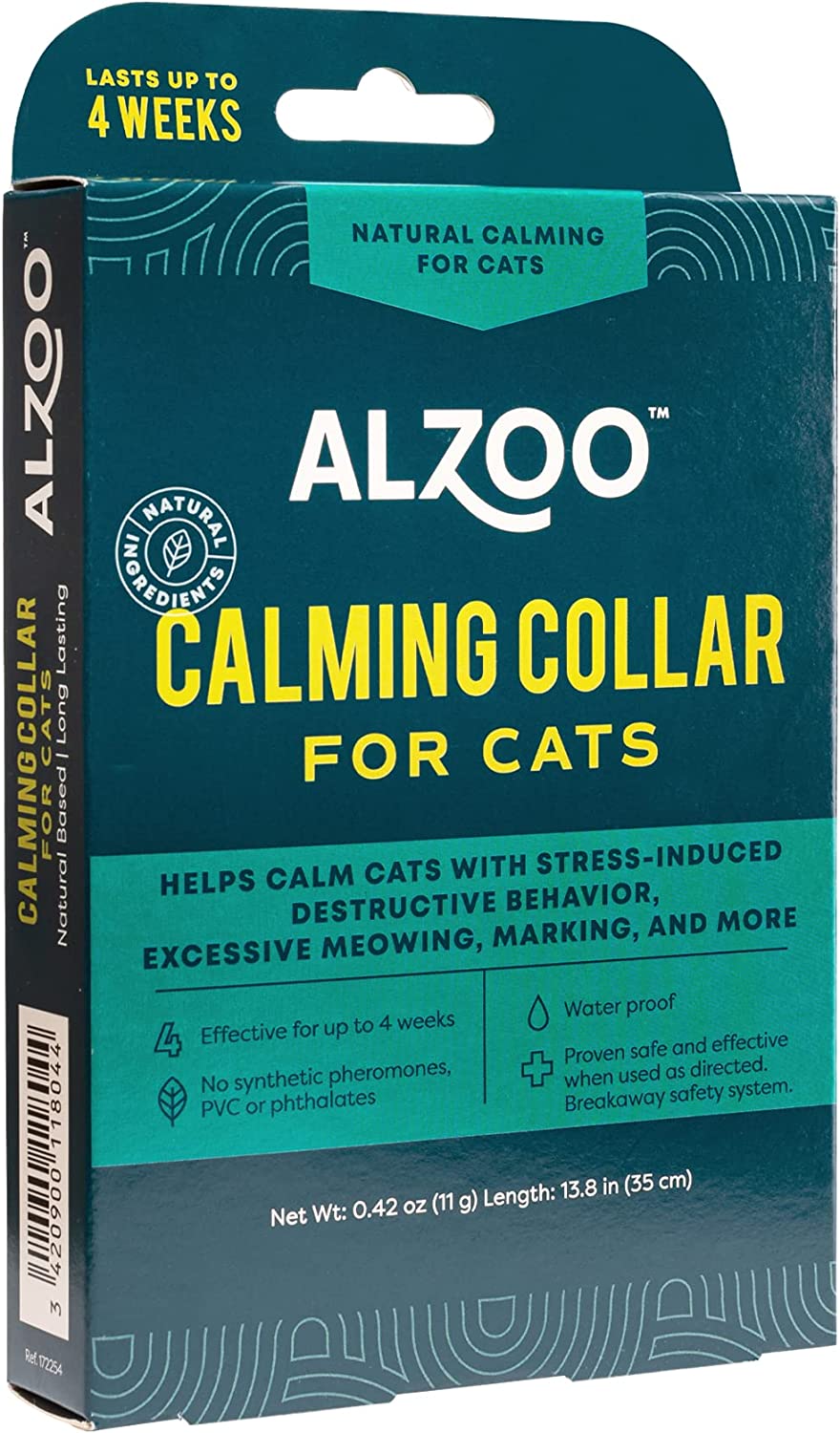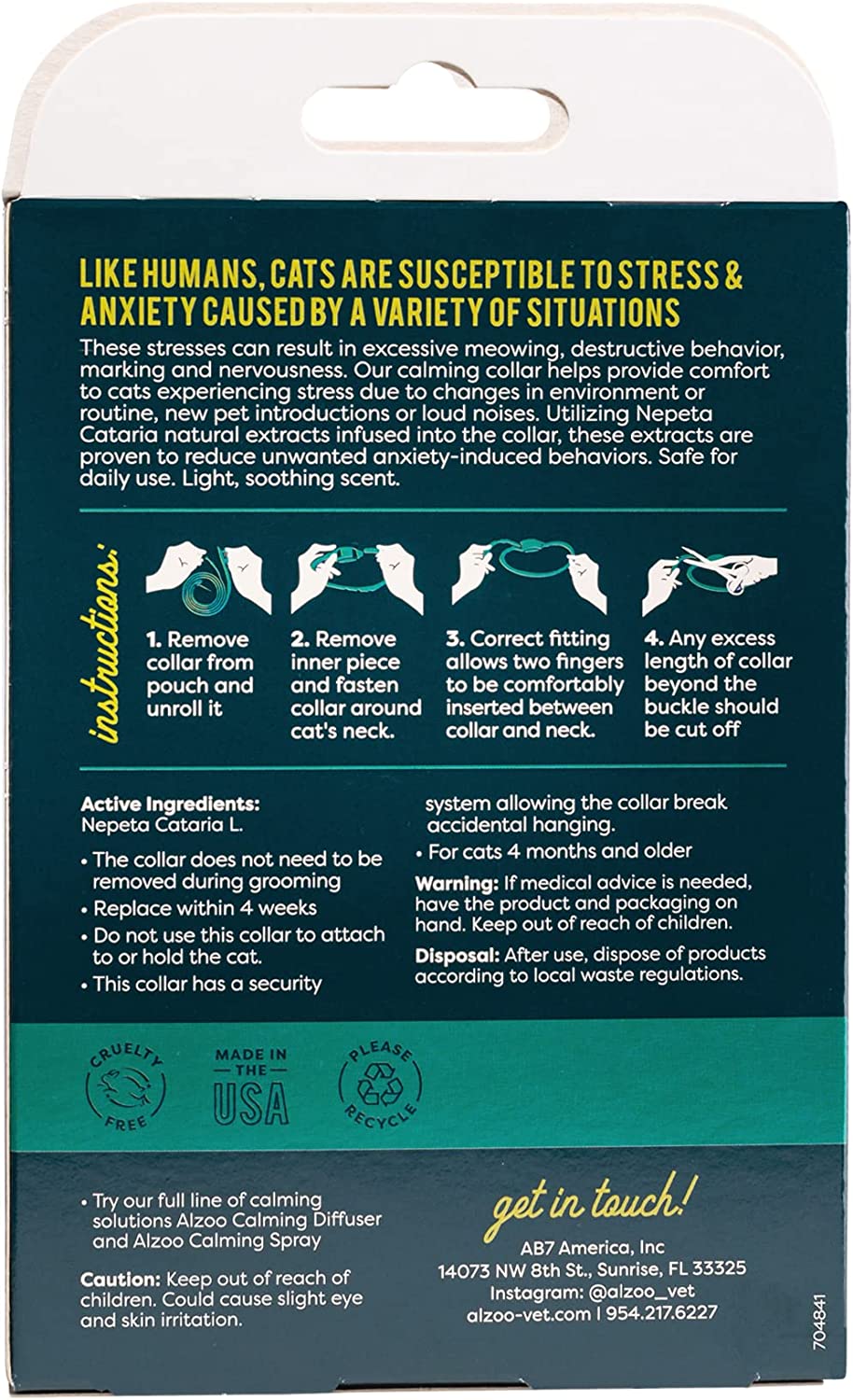 Like humans, cats are susceptible to Stress & Anxiety caused by a variety of situations. These stressors can result in excessive meowing, destructive behavior, marking, nervousness and loss of appetite. Alzoo's All Natural Calming Collar for Cats helps provide comfort to cats experiencing stress due to changes in the environment or routine, new pets introductions, loud noises or more. Utilizing Natural Nepeta Cataria Extracts infused into the collar, these extracts are proven to reduce unwanted anxiety-induced behaviors. Great for continuous calm! The Natural Calming Collar for Cats is waterproof and does not need to be removed while grooming. It is also made with a breakaway safety system, allowing the collar to break preventing accidental hanging.