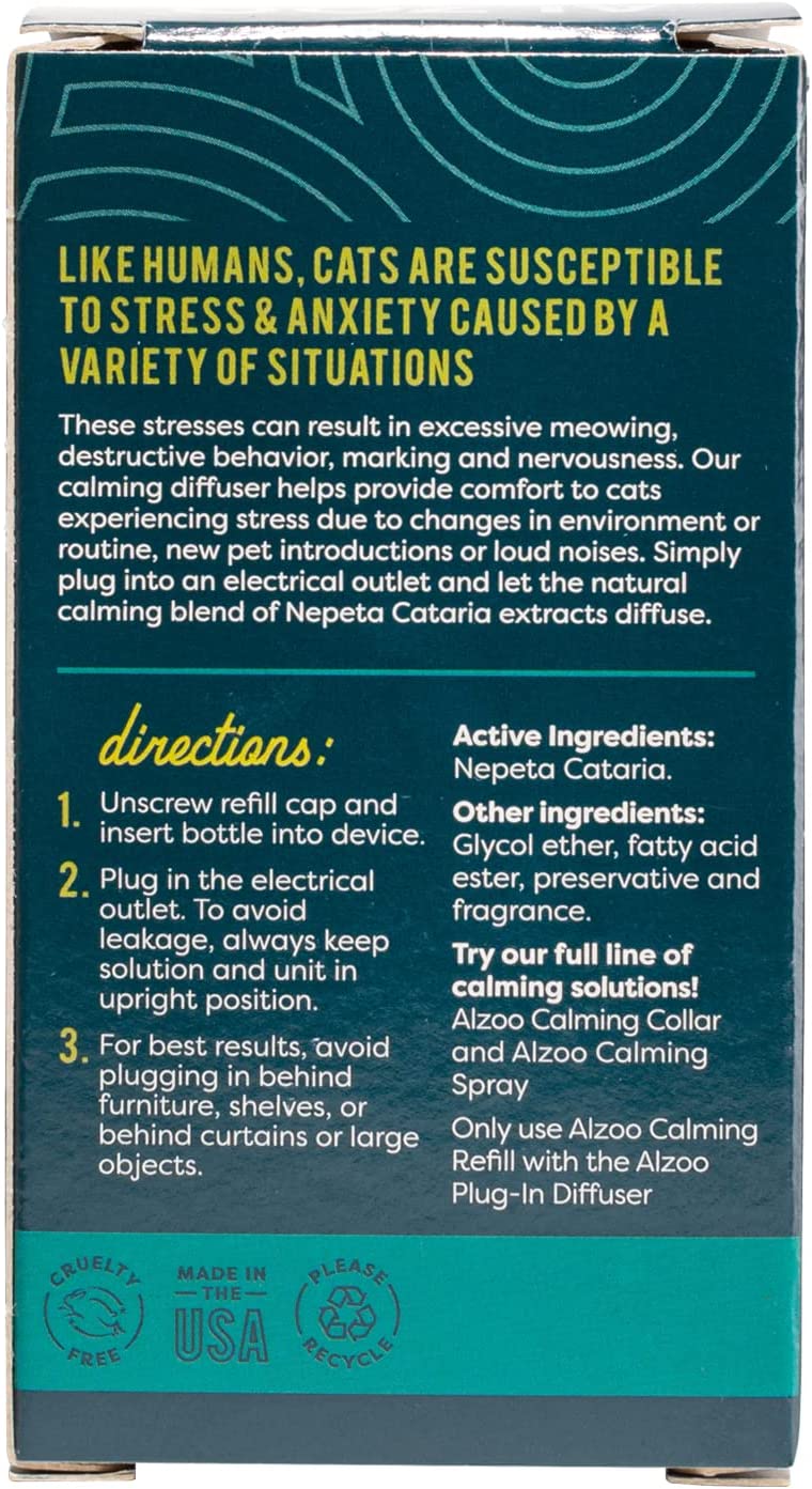Like humans, cats are susceptible to Stress & Anxiety caused by a variety of situations. These stressors can result in excessive meowing, destructive behavior, marking, nervousness and loss of appetite. Alzoo's All Natural Calming Plug-in + Refill helps provide comfort to cats experiencing stress due to changes in the environment or routine, new pets introductions, loud noises or more. Simply plug into an electrical outlet and let the natural calming blend of Nepeta Cataria extracts diffuse. This plug-in is effective for up to 4 weeks and covers up to 500 sq. ft.
