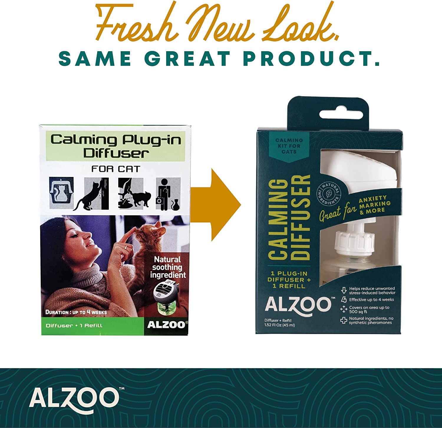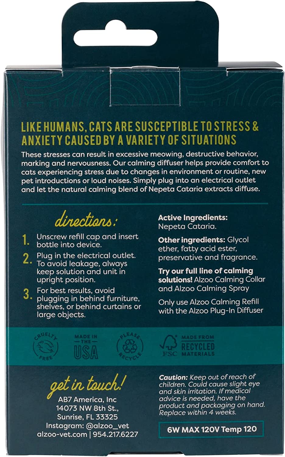Like humans, cats are susceptible to Stress & Anxiety caused by a variety of situations. These stressors can result in excessive meowing, destructive behavior, marking, nervousness and loss of appetite. Alzoo's All Natural Calming Plug-in + Refill helps provide comfort to cats experiencing stress due to changes in the environment or routine, new pets introductions, loud noises or more. Simply plug into an electrical outlet and let the natural calming blend of Nepeta Cataria extracts diffuse. This plug-in is effective for up to 4 weeks and covers up to 500 sq. ft.