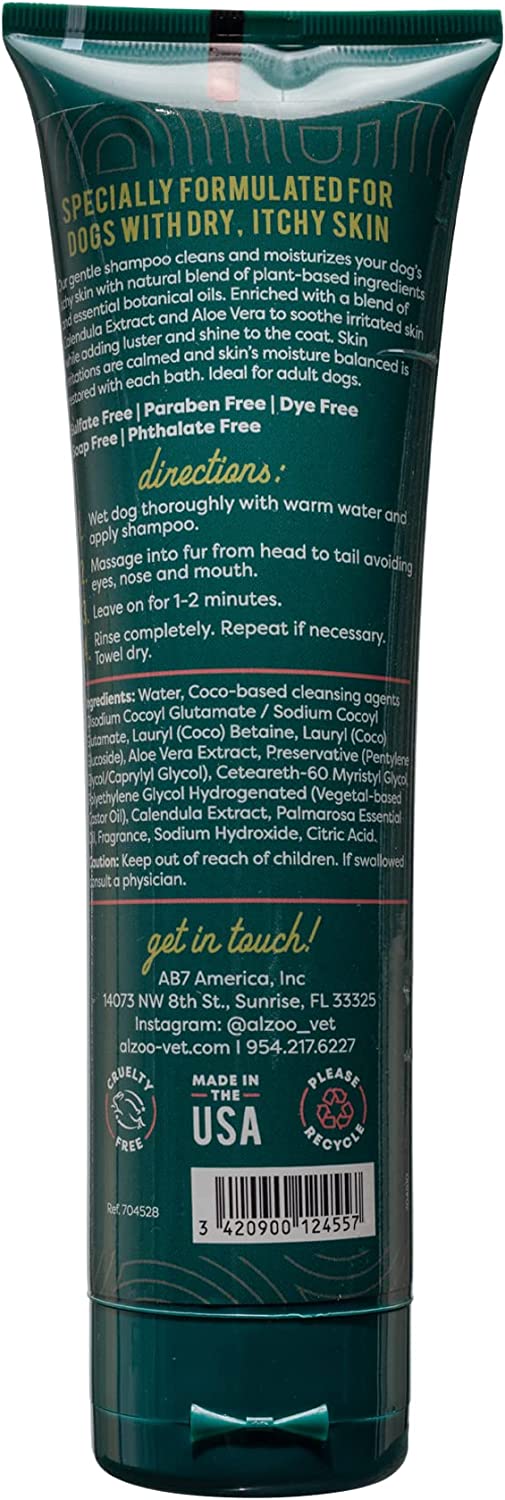 Alzoo Anti-Itch Dog Shampoo is specially formulated for dogs with dry, itchy skin. Their gentle shampoo cleans and moisturizes your dog’s itchy skin with a natural blend of plant-based ingredients and essential botanical oils. The Anti-Itch Shampoo is enriched with a blend of Calendula Extract and Aloe Vera to soothe irritated skin while adding luster and shine to the coat. Skin irritations are calmed and skin’s moisture balanced is restored with each use. Ideal for adult dogs.