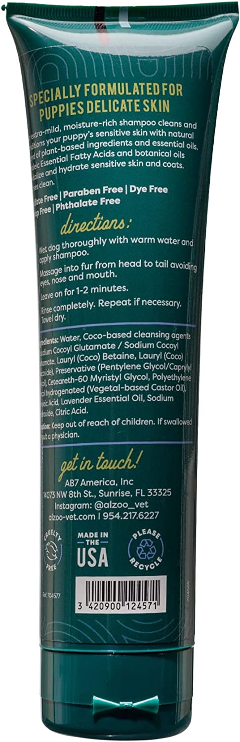 Alzoo's Gentle Puppy Shampoo is specially formulated for a puppy’s delicate skin. Their extra-mild, moisture-rich shampoo cleans and conditions your puppy’s sensitive skin with a natural blend of plant-based ingredients and essential oils. Alzoo Gentle Puppy Shampoo is made with Linoleic Essential Fatty Acids and botanical oils to revitalize and hydrate sensitive skin and coats. Rinses clean.