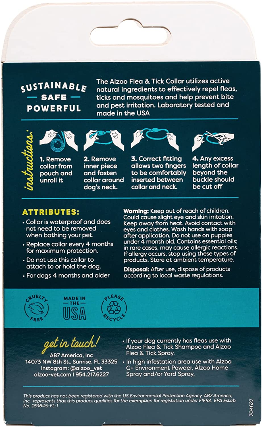 The Alzoo Flea & Tick Collar utilizes active natural ingredients to effectively repel fleas, ticks, and mosquitos and help prevent bite and pest irritation. Alzoo Flea & Tick Collars protect your dog against external parasites efficiently and for the long-term. This Collar is waterproof and does not need to be removed from your dog when bathing. Laboratory tested and Made in the USA.  For maximum protection Alzoo Flea and Tick Repellent Collars, Spray, Shampoo, and G+ powder can be used together.