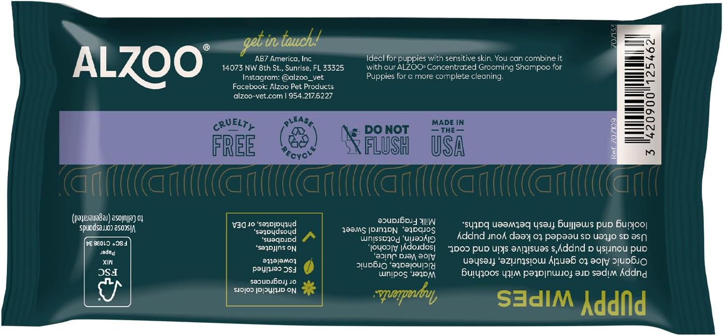 The ALZOO™ Plant-Based Grooming Wipes for Puppies are formulated with soothing Organic Aloe Vera Juice to gently moisturize, freshen and nourish a puppy’s sensitive skin and coat. Use as often as needed to keep your puppy looking and smelling fresh between baths. For even more efficient results, you can combine with ALZOO™ Plant-Based Shampoo Gentle Puppy or ALZOO™ Concentrated Shampoo Powder Puppy Care.