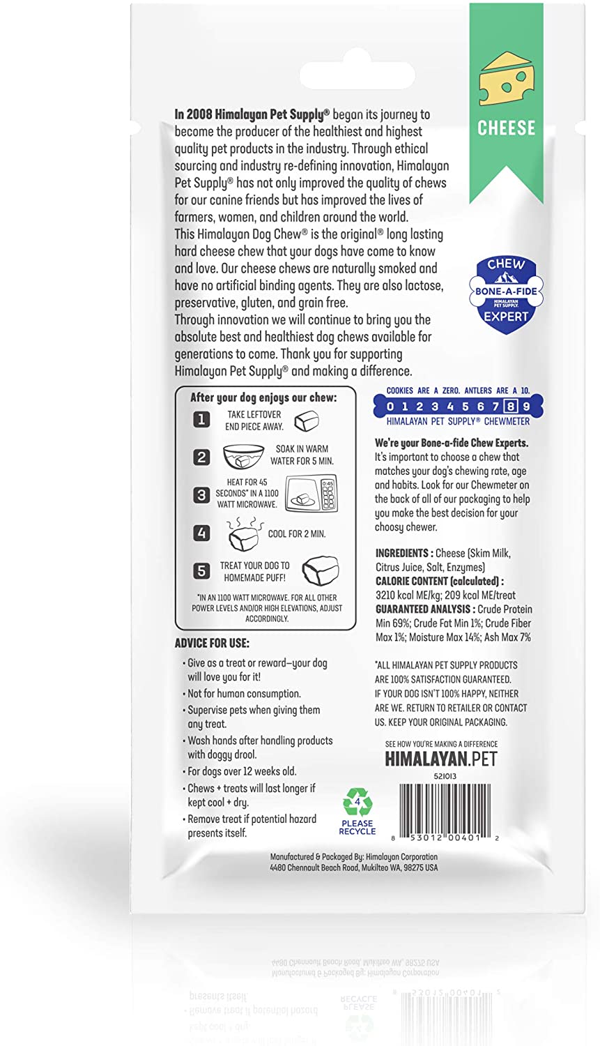 The Original Himalayan Dog Chew is a very long lasting dog chew. Himalayan Dog Chews are made by boiling yak and cow milk and then dried for several weeks to create a hard chew. Dogs must work the end of the treat for hours, softening it with their mouths before small parts of it can be slowly scraped off. It is 100-percent natural with no preservatives. It is an authentic type of cheese eaten by the people of the Himalayas.