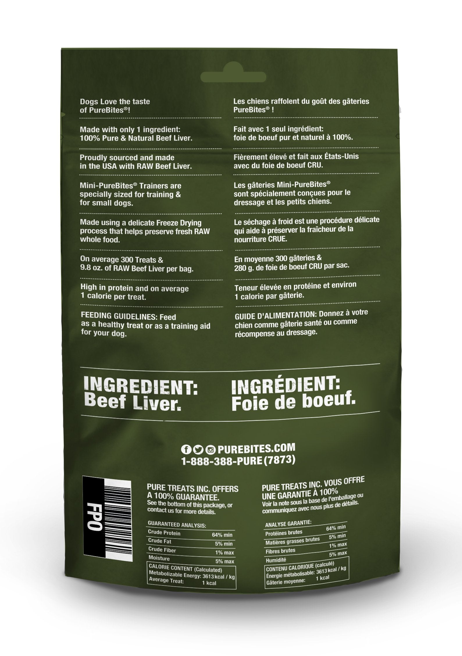 Go ahead, turn the bag around and look at our ingredients. Mini-PureBites RAW Freeze Dried Beef Liver Trainers are made with only 1 ingredient; 100% Pure USA Sourced & Made Human Grade Beef Liver. Mini-PureBites Trainers offer pet parents the chance to train their dogs or treat their small dogs with specially cut pieces of RAW Beef Liver. Dogs love the taste of PureBites because our treats are freeze dried RAW to lock in the aroma, texture and freshness they crave. Dog parents love PureBites because our treats are 100% pure and rich in nutrients for a happy and healthy life.